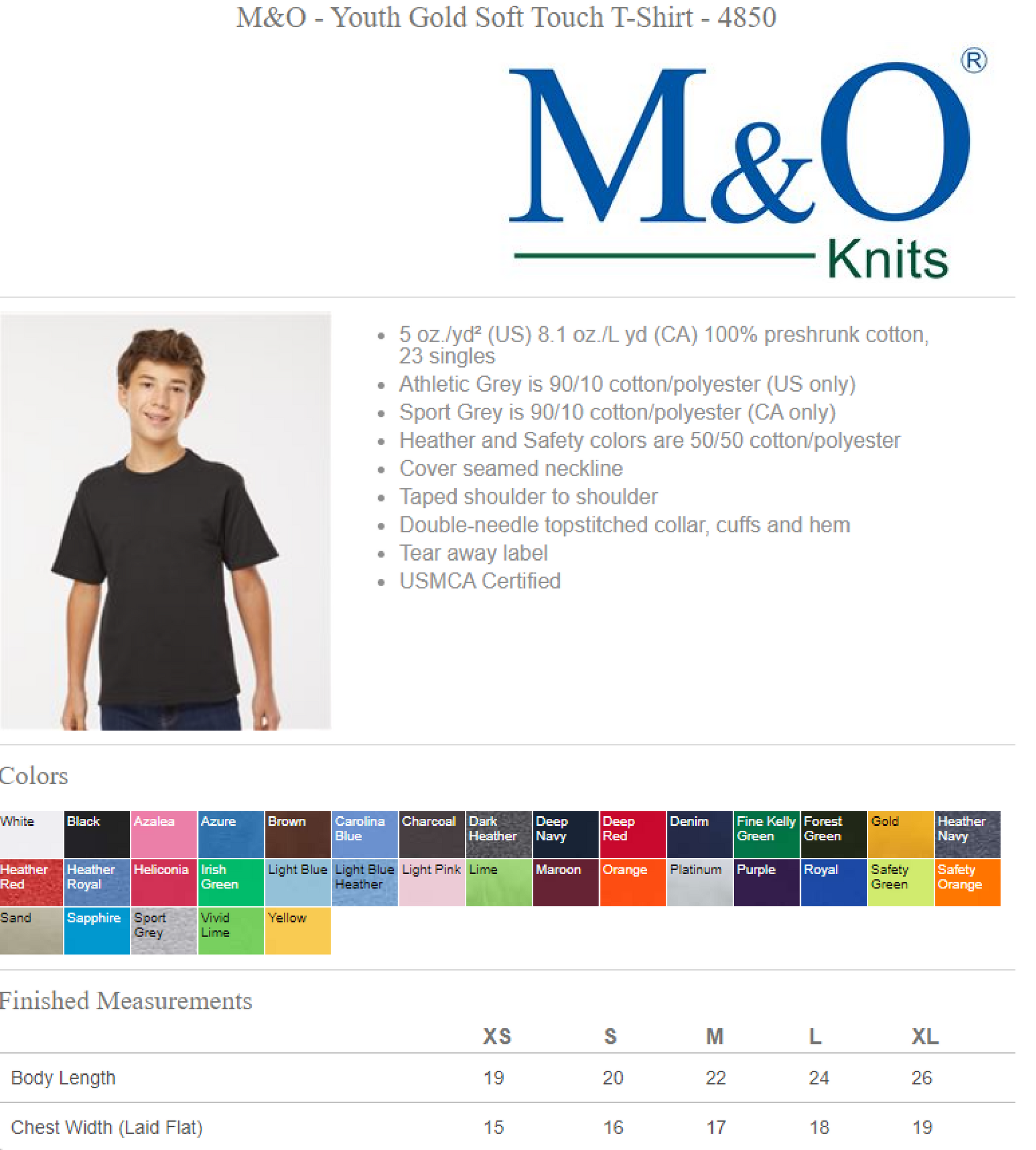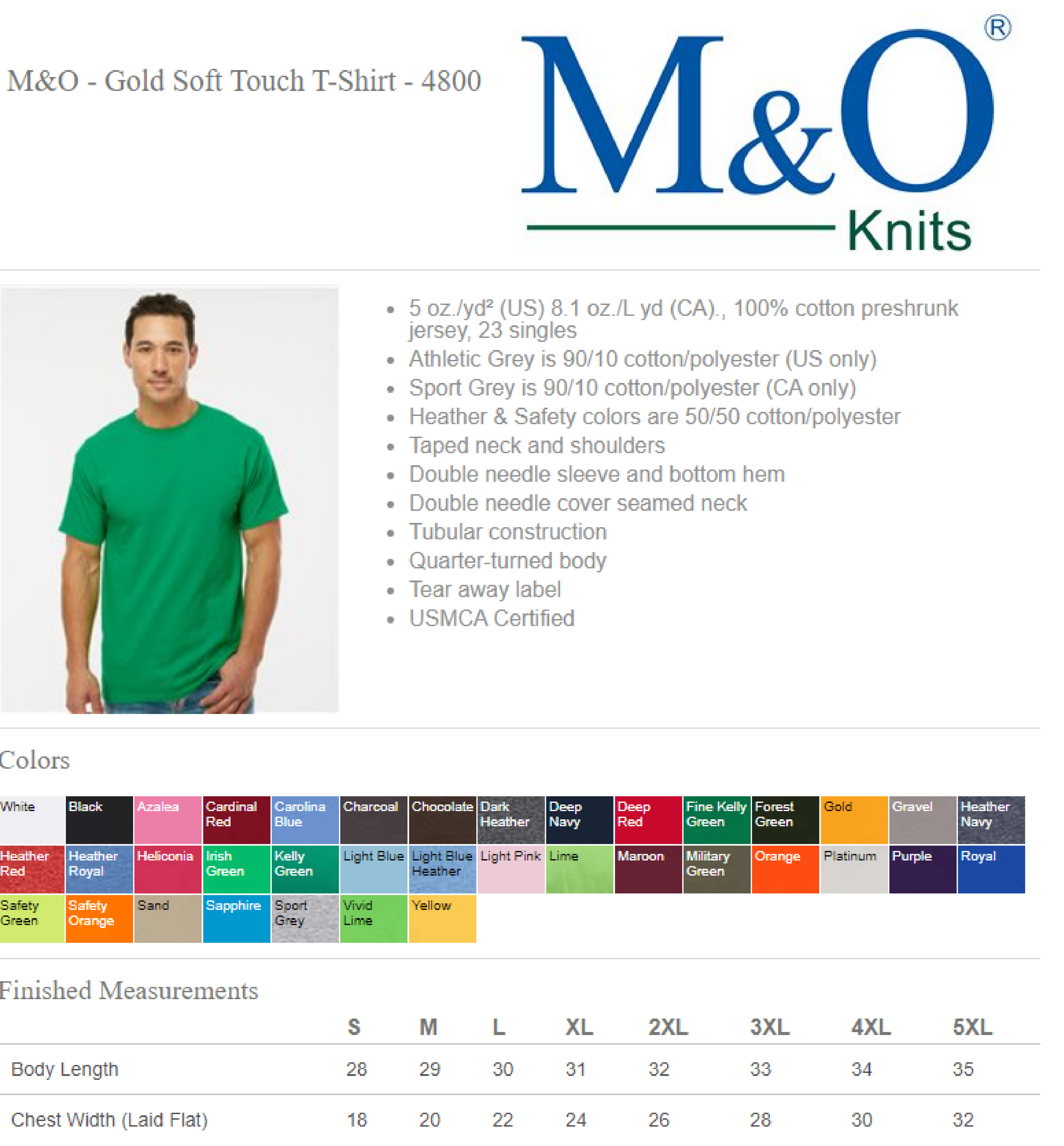 - 5 oz./yd² (US) 8.1 oz./L yd (CA)., 100% cotton preshrunk jersey, 23 singles